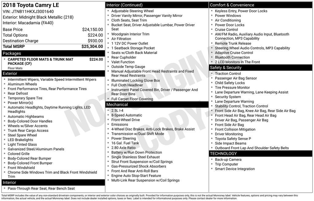 Midnight Black Metallic 2018 Toyota Camry LE FWD 8-Speed Automatic 2.5L I4 DOHC 16V Macadamia Cloth.