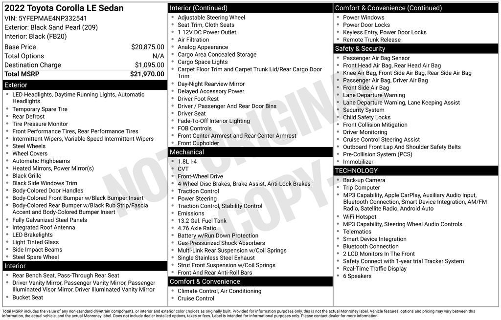 Black Sand Pearl LE FWD CVT 1.8L I4 DOHC 16V Back Up Camera, Bluetooth®, 4-Wheel Disc Brakes, 6 Speakers, ABS brakes, Air Conditioning, AM/FM radio: SiriusXM, Apple CarPlay/Android Auto, Auto High-beam Headlights, Automatic temperature control, Brake assist, Dual front impact airbags, Dual front side impact airbags, Electronic Stability Control, Emergency communication system: Safety Connect with 1-year trial, Exterior Parking Camera Rear, Four wheel independent suspension, Front anti-roll bar, Front Bucket Seats, Fully automatic headlights, Knee airbag, Low tire pressure warning, Occupant sensing airbag, Overhead airbag, Passenger door bin, Power door mirrors, Power steering, Rear anti-roll bar, Rear side impact airbag, Rear window defroster, Remote keyless entry, Security system, Speed control, Split folding rear seat, Steering wheel mounted audio controls, Telescoping steering wheel, Tilt steering wheel, Traction control, Variably intermittent wipers, Wheels: 16 Wide Vent Steel.
