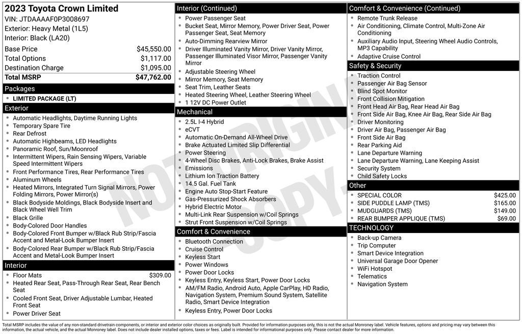 Slip behind the wheel of the Crown Limited and experience the perfect balance of power and efficiency. The 2.5L 4-cylinder DOHC engine, paired with a smooth CVT transmission and standard AWD, delivers an impressive 42 city / 41 highway MPG, making this sedan as economical as it is thrilling to drive.